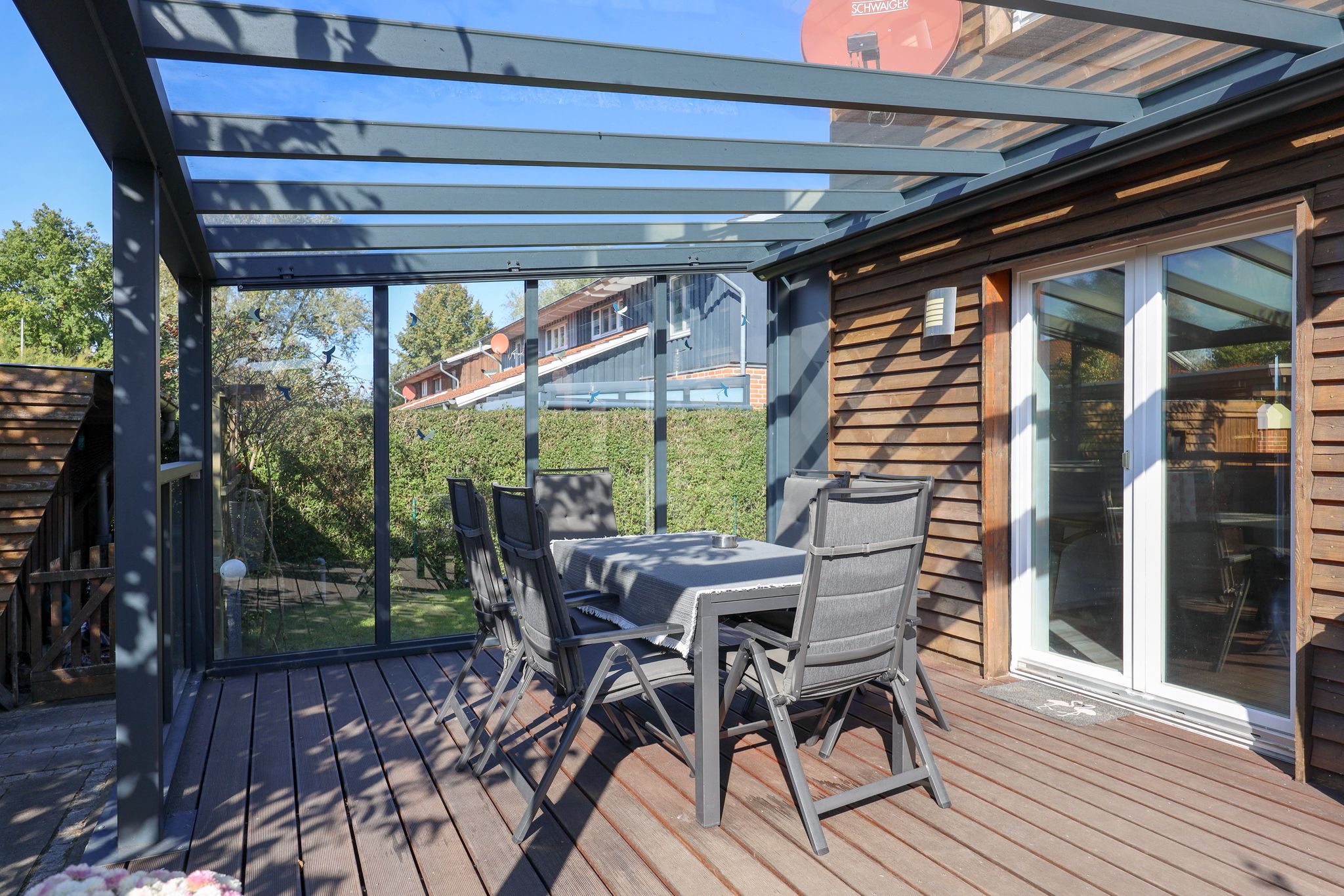 – Kaltwintergarten mit elektrischer Markise und Bankireiholz